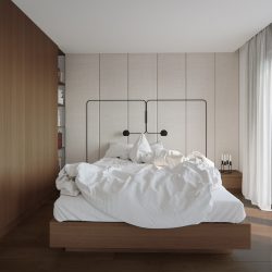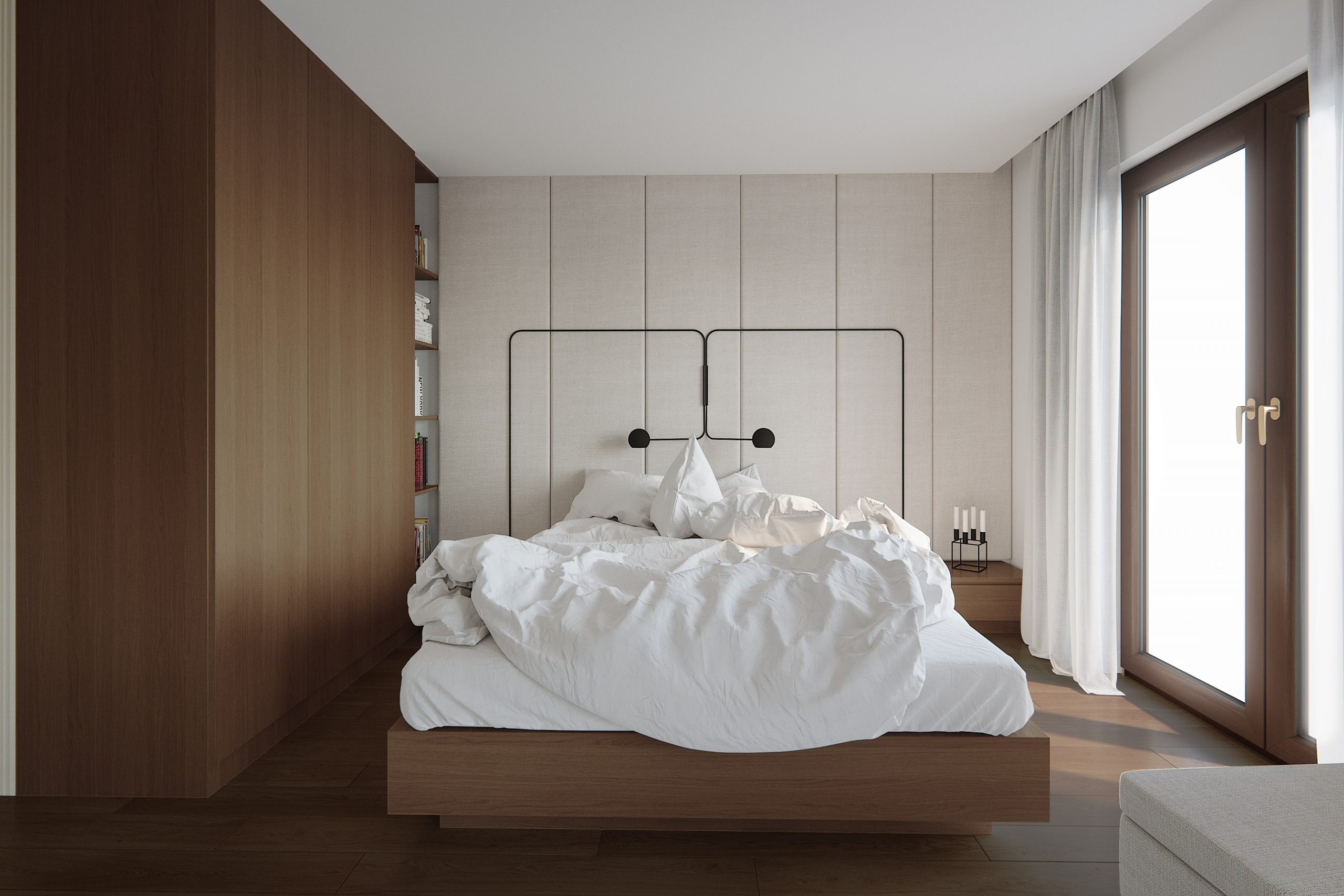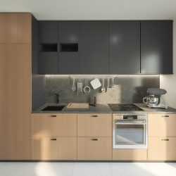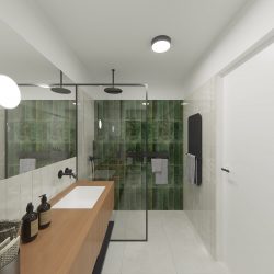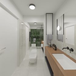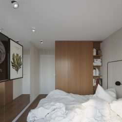 Projekt wnętrza mieszkania w Warszawie z zielenią i naturalnym drewnem w roli głównej.