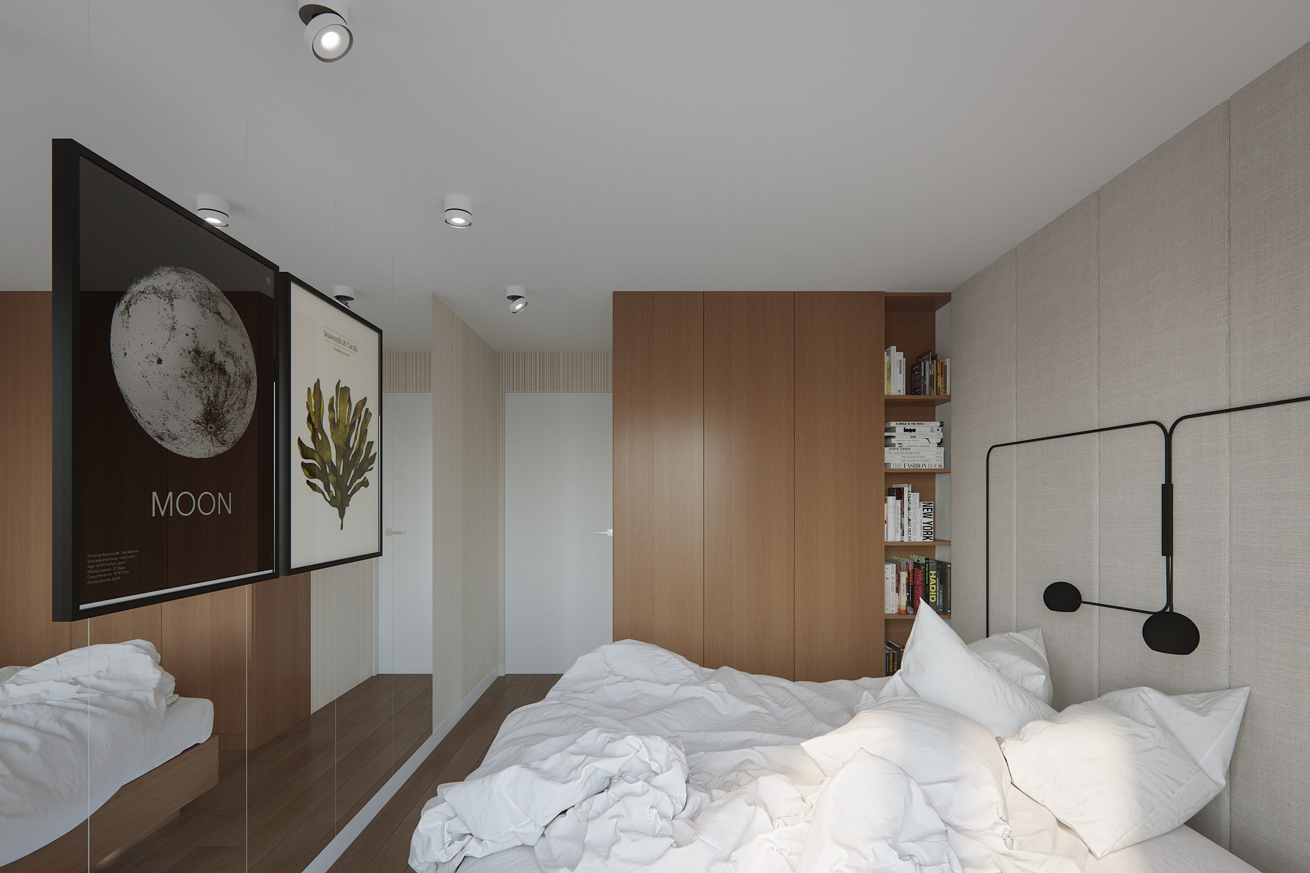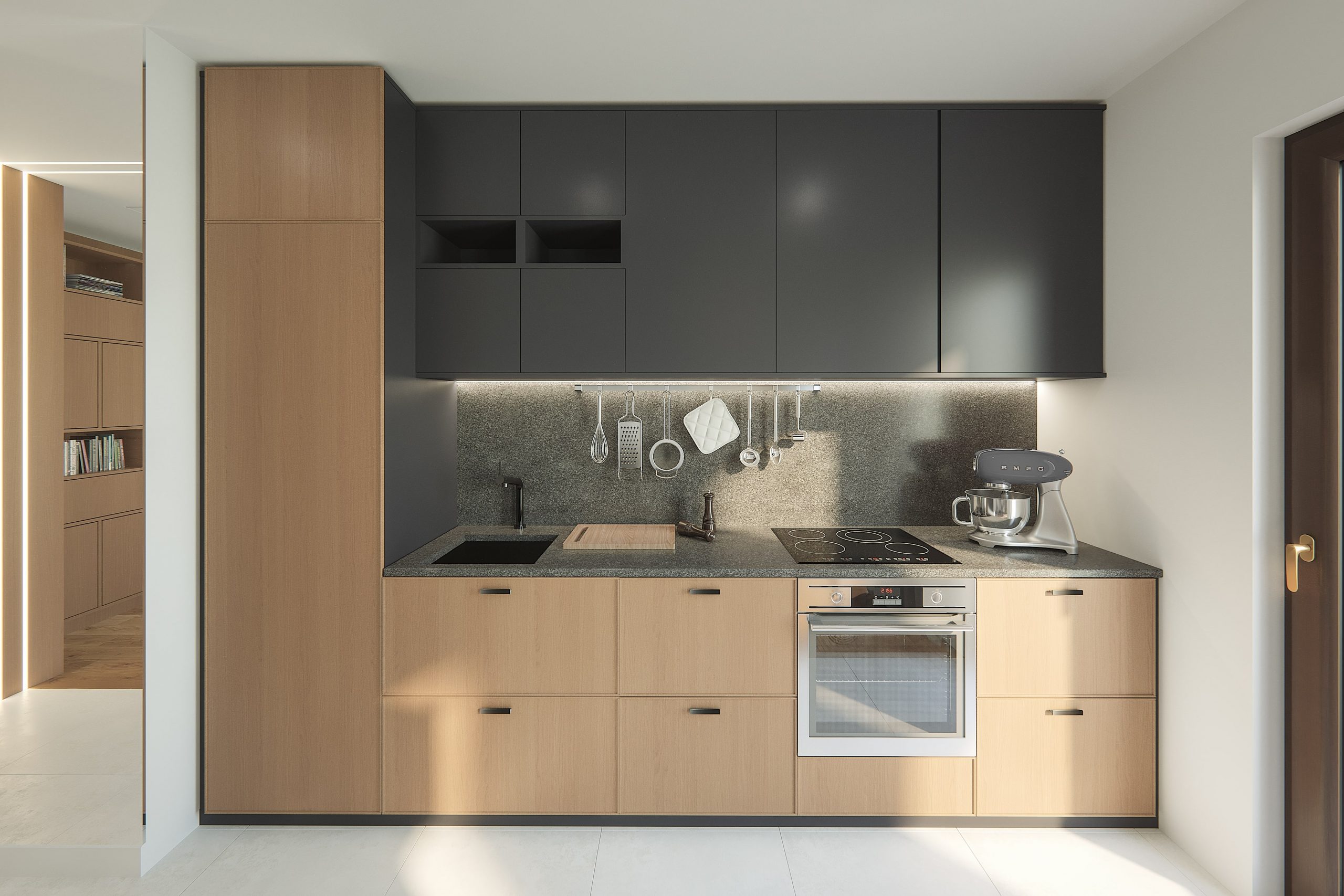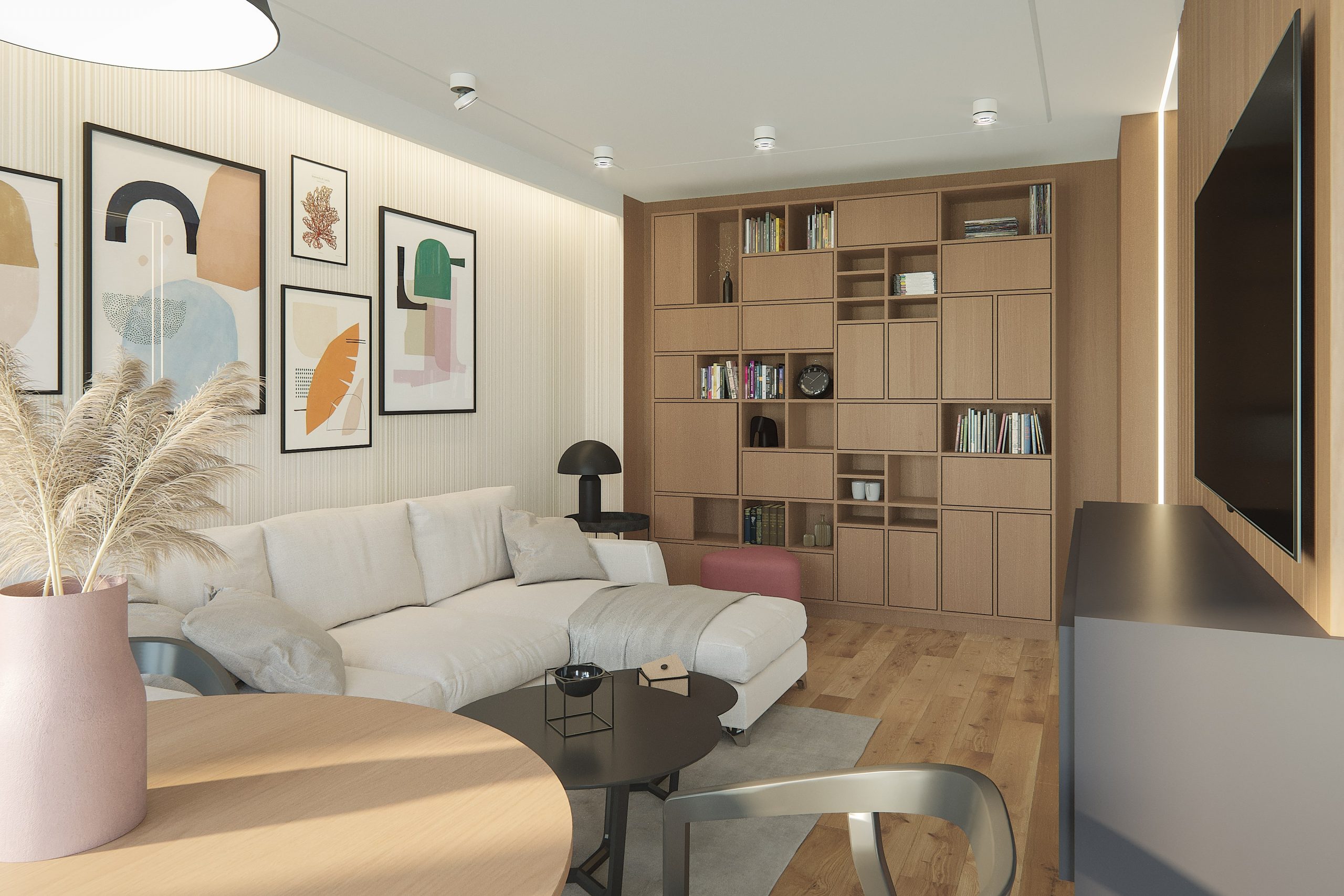 Dębowy regał jako motyw przewodni strefy dziennej. Salon z niewielką jadalnią, przestronny aneks kuchenny plus master bedroom.